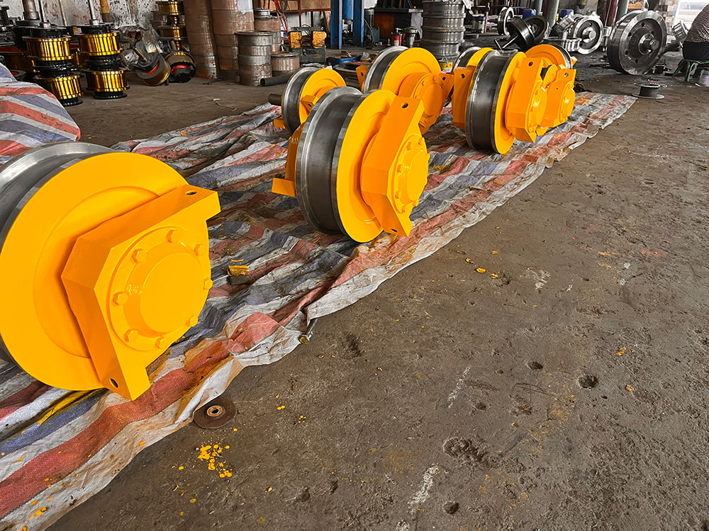 起重機車輪組:起重機運行機構(gòu)車輪的水平偏斜值是起重機重要的技術(shù)參數(shù),偏斜值超差會造成啃軌,增大運行阻力,產(chǎn)生振動和噪音,加劇軌道和車輪磨損,大大降低起重機使用壽命,所以各類起重機制造技術(shù)條件都要對車輪水平偏斜規(guī)定允許的數(shù)值。